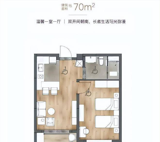社区内活力公寓户户朝南,提供50m²、70m²、93m²的一室一厅和106m²的两室一厅产品,以及50m²的护理院开间,满足不同长者的居住需求。