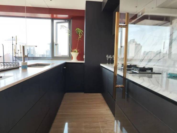 厨房使用全透明玻璃围成一个独立的空间,视觉上显得空间更大,无遮挡。欧洲极简风通常采用这种开放式布局,将不同功能的区域无缝连接在一起。这种设计理念创造了宽敞、流畅的空间流动。