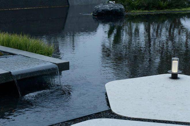 转过光屏,外部的嘈杂与之隔绝开,潺潺流水先闻其声,近景水面粼粼,远景山石静卧,动静结合,山水之间,更显纯粹。场景的更迭伴随情绪的转换,访客心情由浮躁归为平静。水景之中点缀几处跳泉,荡漾微波,延绵扩散,为静谧的景致中增添了一抹动态之感。人们在水泉旁停留,潺潺流水的声音洗涤着心灵,灵感如泉水般涌现。
