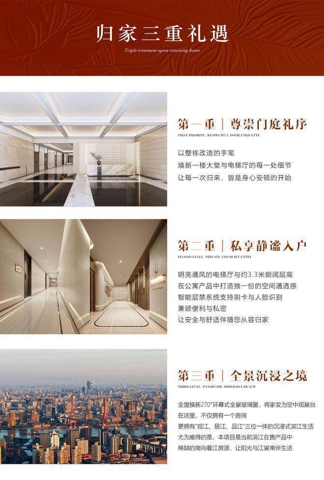【第一重尊崇门庭礼序】以整栋改造的手笔焕新一楼大堂与电梯厅的每一处细节让每一次归来,皆是身心安顿的开始·【第二重私享静谧入广】明亮通风的电梯厅与约3.3米朗阔层高在公寓产品中打造独一份的空间通透感智能层禁系统支持刷卡与人脸识别兼顾便利与私密·【第三重|全景沉浸之境】全屋换新270°环幕式全景玻璃窗,将家变为空中观景台在这里,不仅拥有一个房间,更拥有”观江、居江、品江〞三位一体的沉浸式滨江生活。