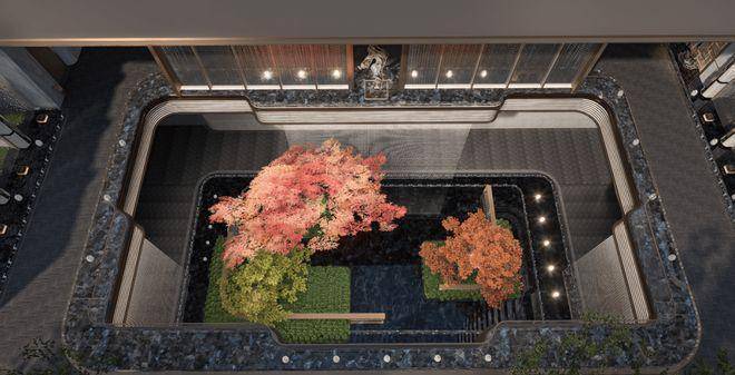 项目利用下沉式景观庭院,结合艺术花园、摩登水景等,打造了一座高端的下沉式会所,规划设有泳池、健身房、行政酒廊等场景。