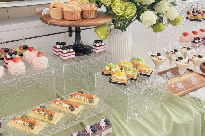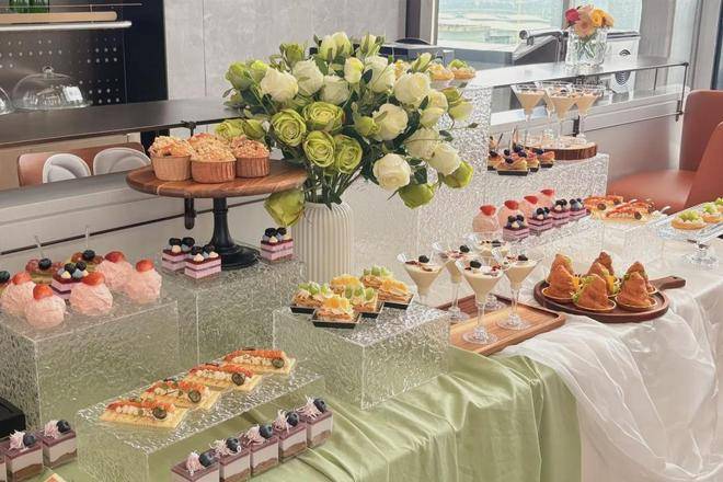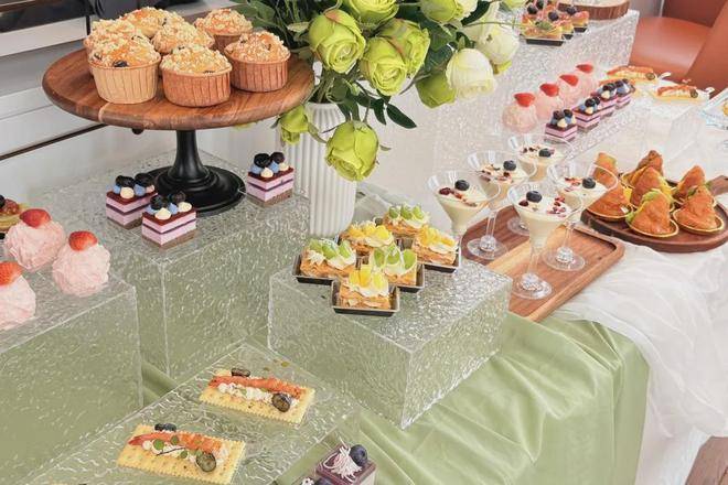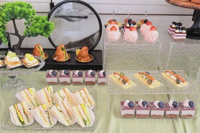 铺着雅致浅绿与白色桌布的长桌上,甜点在透明的亚克力展示架上错落呈现,缤纷的三明治、诱人的各式小蛋糕琳琅满目。