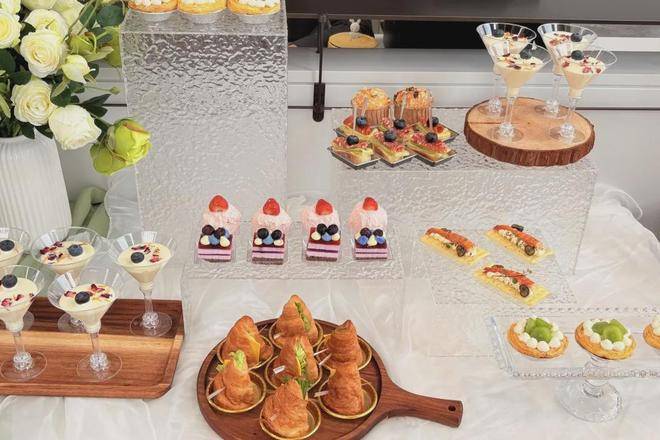 走进现场,映入眼帘的是精心布置的绿意盎然。透明玻璃台上,紫色慕斯蛋糕点缀莓果,草莓泡芙、鲜果拿破仑酥...演绎精致视觉美学。
