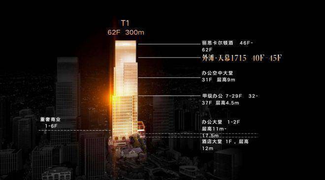 在这片建筑群中,总高达300米的T1是最引人瞩目的存在。底部1-6层为重奢商业,中部7-37层为甲级办公,中高区40-45层为行政公馆外滩·天幕1715,上部46-62层为丽思卡尔顿酒店,与浦东陆家嘴丽思卡尔顿酒店遥相呼应。
