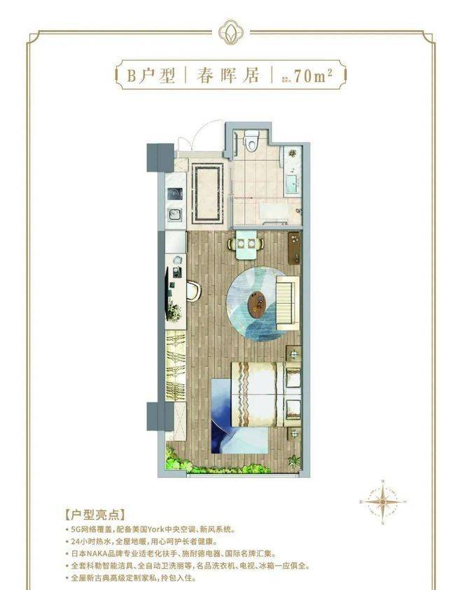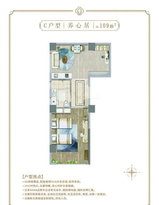 房间根据入住人数配备床位;卫生间24小时保持热水供应,配有科勒全套智能洁具、滚筒洗衣机、安全起身扶手和一个紧急报警拉绳;所有户型均有景观阳台,可以晾晒衣物。