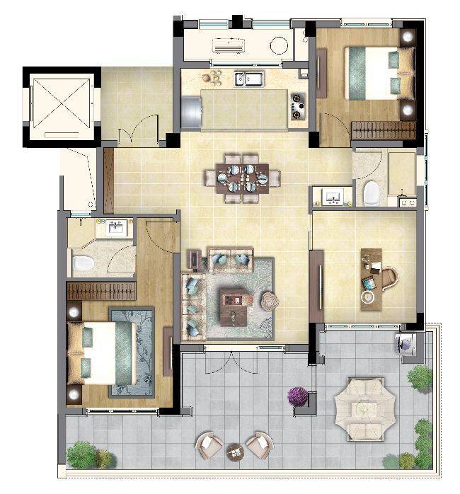 南向露台面积达30多个平方,不计入房型面积内。