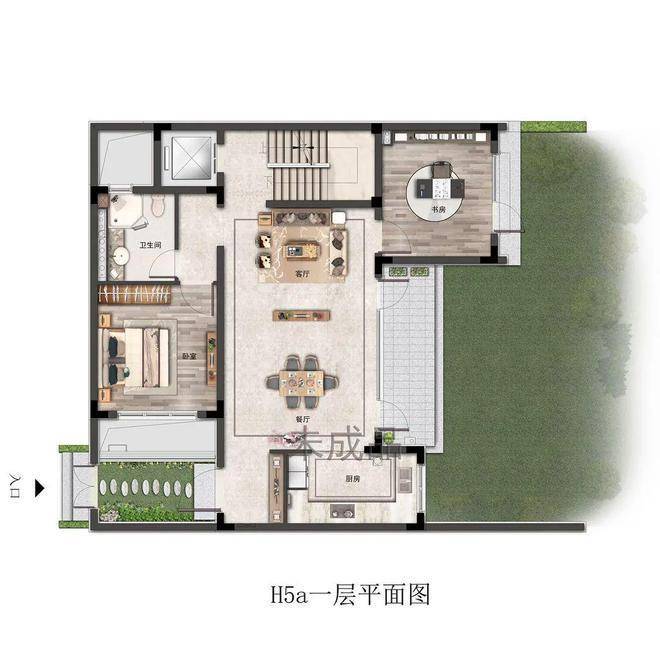 一层主要作为会客功能。样板间将一楼书房空间打开,与餐厨空间相连,更显空间感,推门就可独赏自家院中美景。 还贴心设计了一个父母房,方便老人起居。